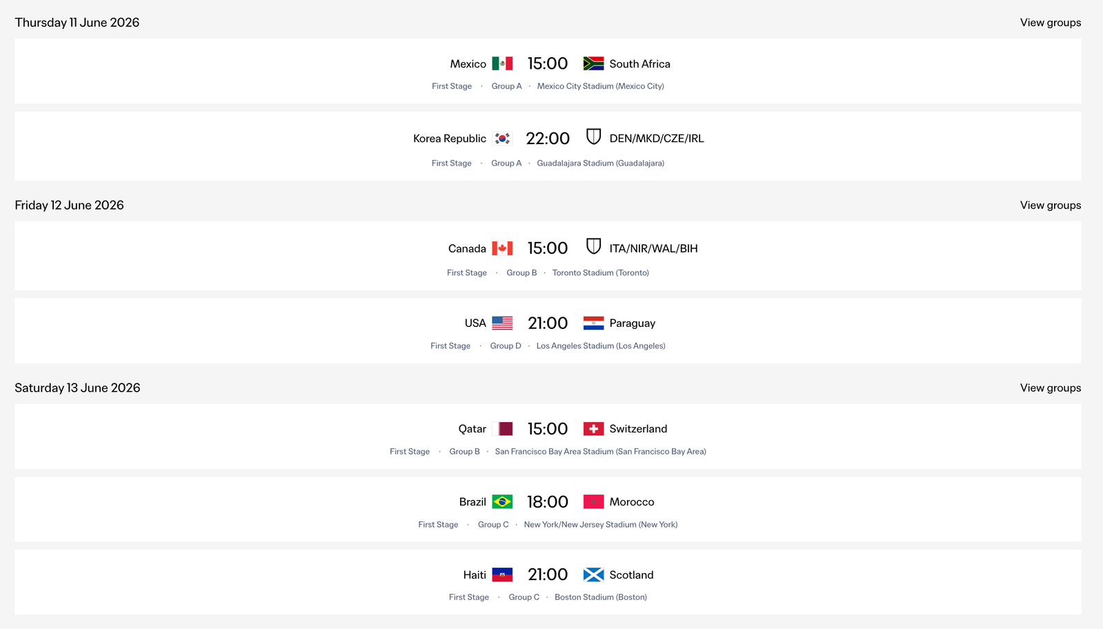 | 2026-06-19 | Mexico | vs | South Korea | |